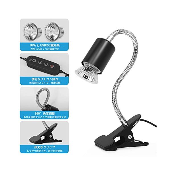 亀ライト 両生類用ライト 爬虫類 ライト UVA+UVB 無段階調光 タイマー機能 25W+75W 2つ電球付き トカゲ カメレオンの飼育に最適
