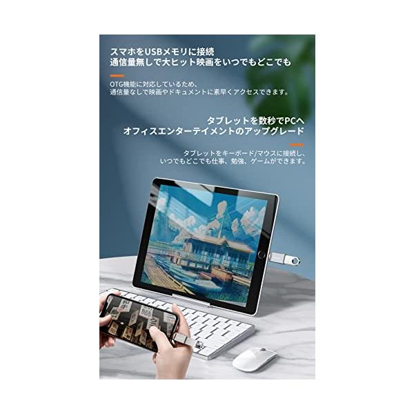 ・【USBメモリ対応】:スマホをUSBメモリに接続して、ファイルバックアップを取ることでスマホを容量不足から開放します。写真や動画を素早くバックアップし、スマホの容量を簡単に拡張して、よりスムーズに動作させることができます。【ライトニング端子のiPadも対応】:タブレットを数秒でPCへ、オフィスエンターテイメントのアップグレードできます。タブレットをキーボード/マウスに接続し、いつでもどこでも仕事、勉強、ゲームができます。