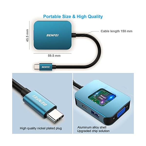 ・コンパクトな USB C ハブ - BENFEI USB Type-C to HDMI+USB+VGA+Power Delivery アダプターは、HDMI ポート 1 つ、VGA ポート 1 つ、USB-C 充電ポート 1 つ、USB-A ポート 1 つを USB-C ラップトップに追加します。 単一の USB-C ポート。 この軽量ガジェットをバッグやポケットに入れて、ラップトップとプロジェクターでビジネス プレゼンテーションを行ったり、デスクトップ画面をモニターやテレビに拡張したりできます。