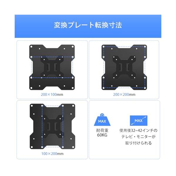 ・【VESA変換プレート規格】50X50mm、75X75mm、100X100mmから100X200mm、200X100mm、200X200mmまでのVESA規格に転換できます。?モニターアーム、テレビ壁掛け金具に適します。?対応サイズ:32〜42インチ?耐荷重:60KG