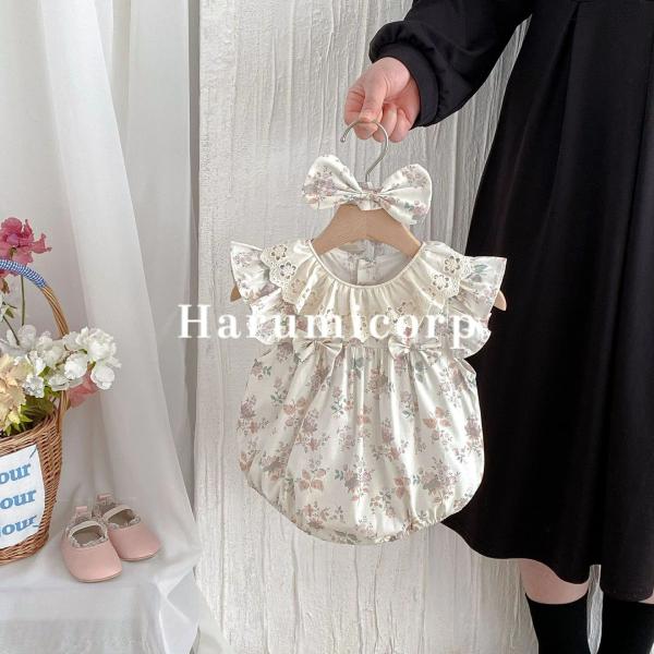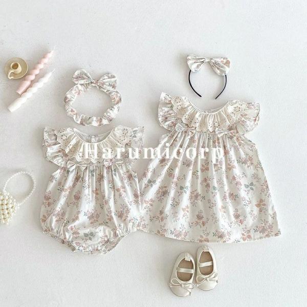 ベビー服 姉妹コーデ ヘアアクセサリー付き ロンパース ワンピース ドレス 花柄 女の子 ベビー キッズ 夏服 子ども 子供 新生児 赤ちゃん 姉妹