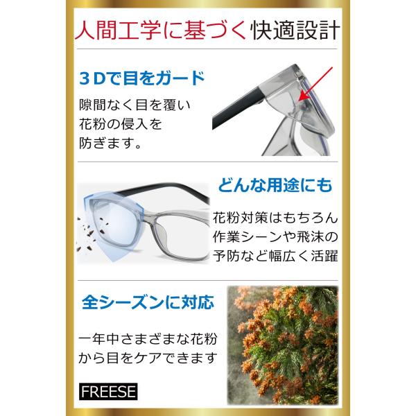 3D立体設計で花粉の侵入をガード。目のサイド部分も覆う設計で隙間を極力なくし、防護性を高めました。