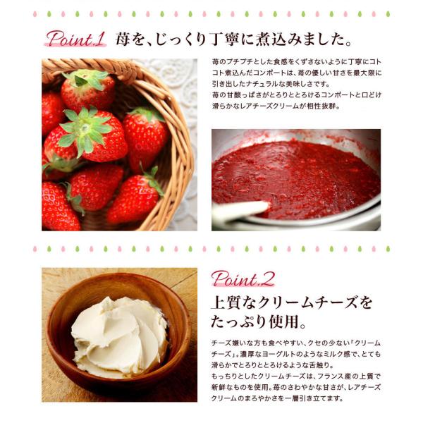 口どけなめらかなレアチーズクリームと、甘酸っぱい苺のコンポート、しっとり香ばしいアーモンドのスポンジを敷いた苺のレアチーズケーキです。