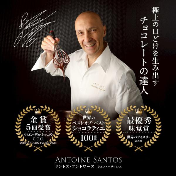 乾燥クレープとライスクリスピー、そして砕いた香ばしいアーモンドを、サントスシェフが厳選したヴァローナ社の高級チョコレートでコーティングしました。