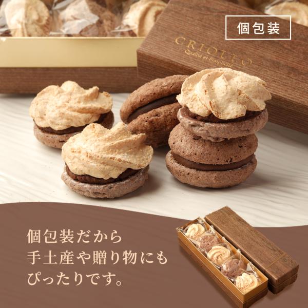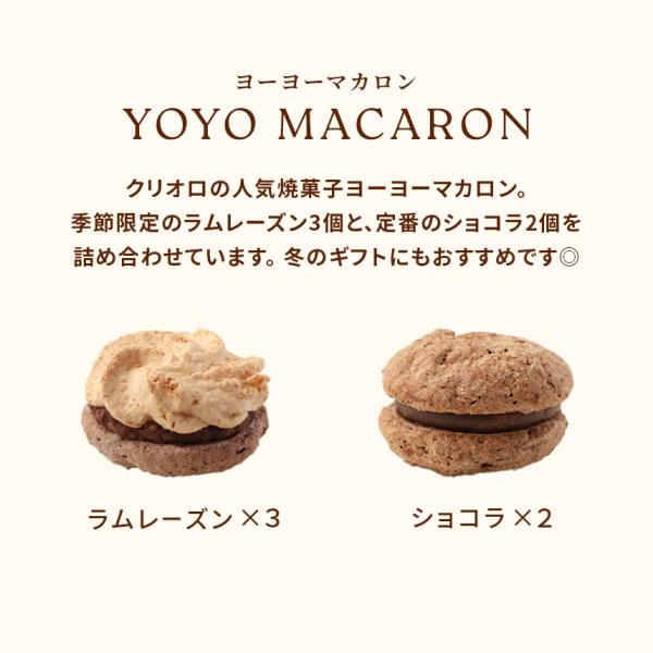 クリオロの人気焼菓子ヨーヨーマカロン。季節限定のラムレーズン3個と、定番のショコラ2個を詰め合わせています。