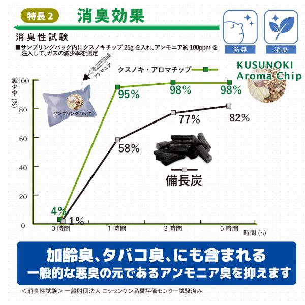●消臭効果:加齢臭、タバコ臭にも含まれる一般的な悪臭の元である<アンモニア臭>を抑えます。