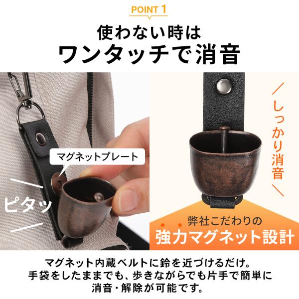 鈴をベルトのマグネットにつけるだけでしっかり消音モードにできるので、公共の場所や人の多い登山道など使わない時には音が鳴らないようにできます。こだわりの強力マグネット設計で音を抑えることができる設計です。