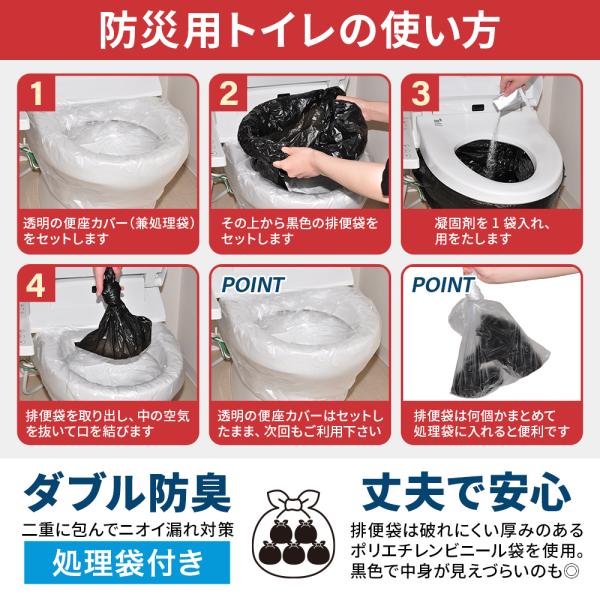 (セット内容)凝固剤5個 黒色ポリエチレンビニール袋(排便袋)5枚 便座カバー用透明袋(処理袋)1枚 ティッシュ10枚入り×1個 防災ガイド 非常用トイレセット説明書