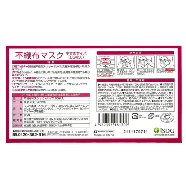 不織布マスク 小さめサイズ 65枚入り あすつく