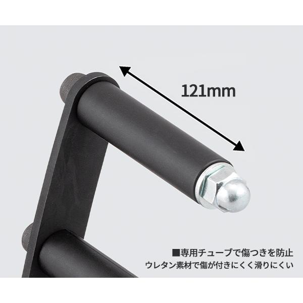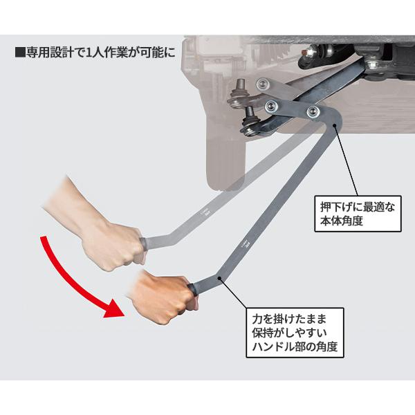 ハンドル一体型構造で、ロアアームに掛けて押すだけの簡単操作。一人作業でも安定