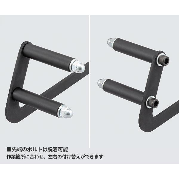 先端ボルトは脱着式で左右付け替え可能。車種や作業スペースに応じて向きを調整できる柔軟性