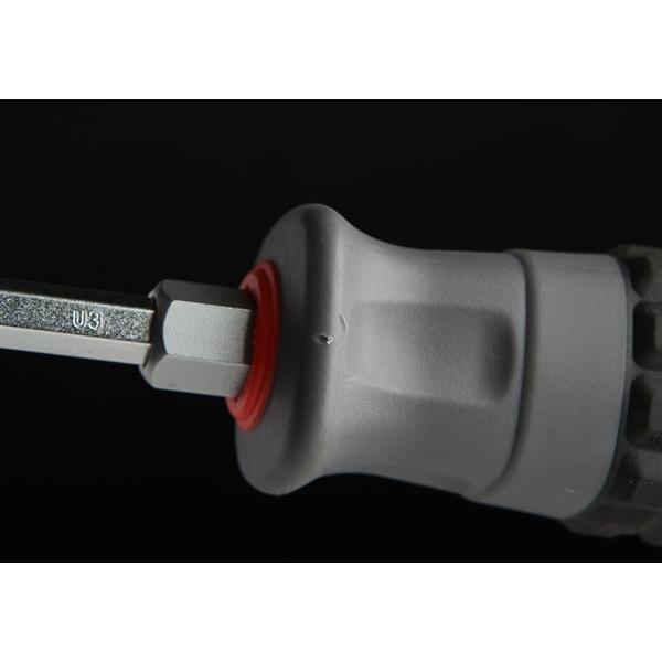 先端は、ビスに対しピッタリとフィットする形状で、ビスとのギャップを少なくし、カムアウト(外に逃げようとする力)を軽減します。