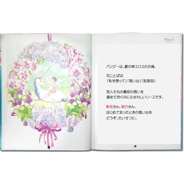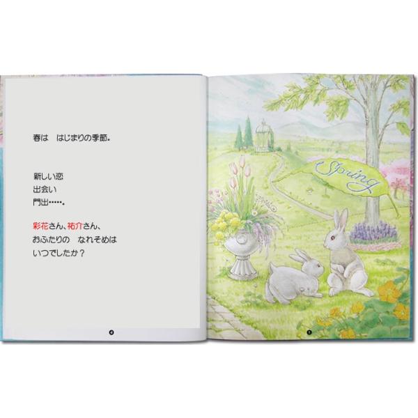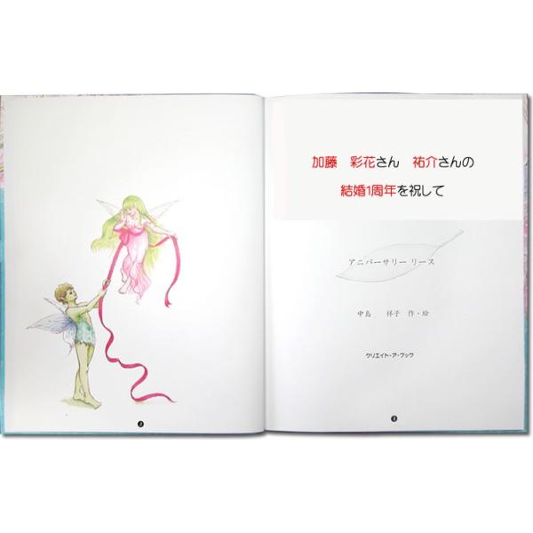 二人の大切な記念日に、花を添えるリースのオリジナル絵本です。主人公の名前、住んでいる所、登場人物、本の贈り主の名前、プレゼント日、主人公へのメッセージなどが印刷できる、セミオーダーメイドの絵本です。