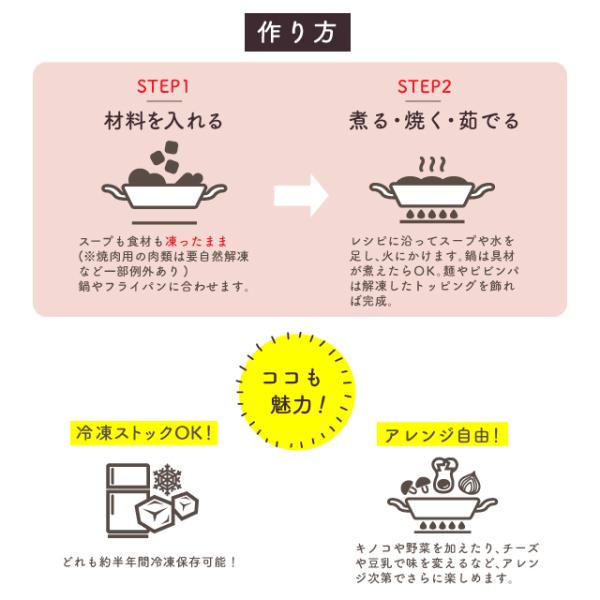 カット済み・下処理済みの材料やタレをセットにしてお届けしますので、2ステップの簡単調理でお店の味をお楽しみいただけます!
