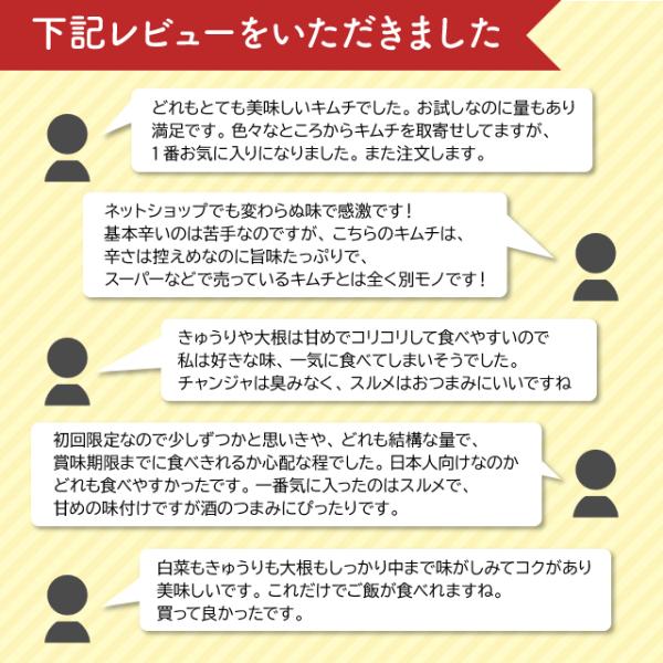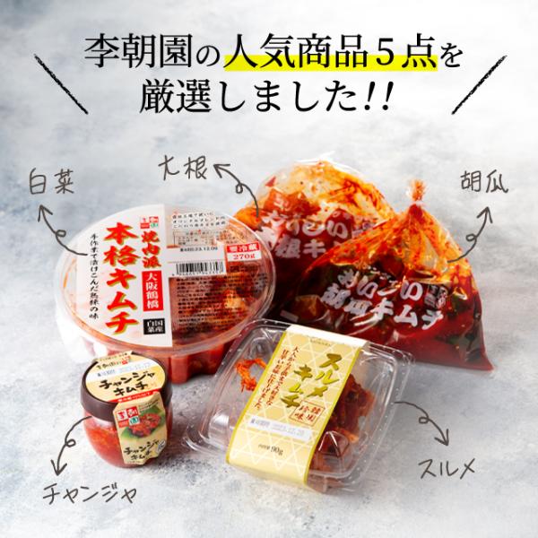 キムチ5点 お試しセット 計約1Kg ( 白菜キムチ /大根/ 胡瓜/チャンジャ/スルメ) キムチ 韓国食品 お取り寄せ ギフト オイキムチ カクテキ 李朝園 おつまみ
