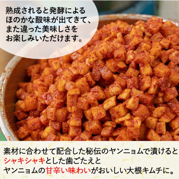 みずみずしい大根のうま味を活かす、にんにくや生姜控えめの専用キムチだれで漬け込みました!