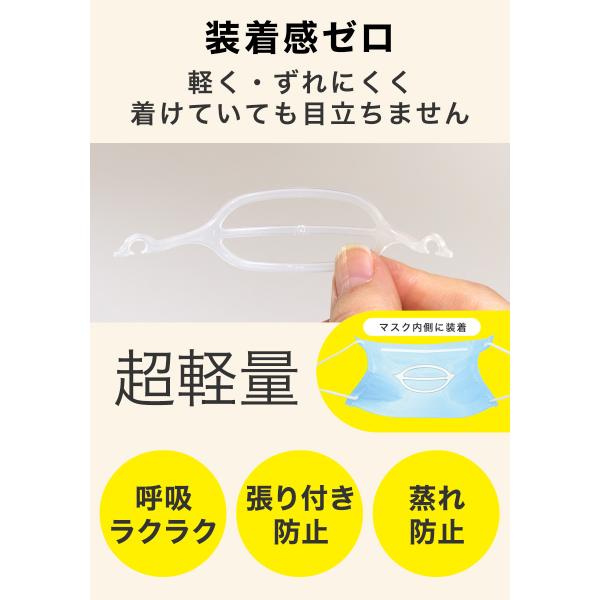 息がしやすい、喋るのがラク、メガネ曇らない、蒸れない、唇がマスクに付かないので化粧が落ちにくく、肌荒れ防止などマスク生活を快適にする目的で開発されました。