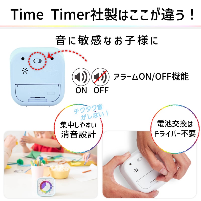 短めのアラーム・静音設計で音に敏感なお子様にも安心。アラームON/OFF可能。デスクでも邪魔にならず、インテリアにもなじむモダンデザイン。正規品で安心。