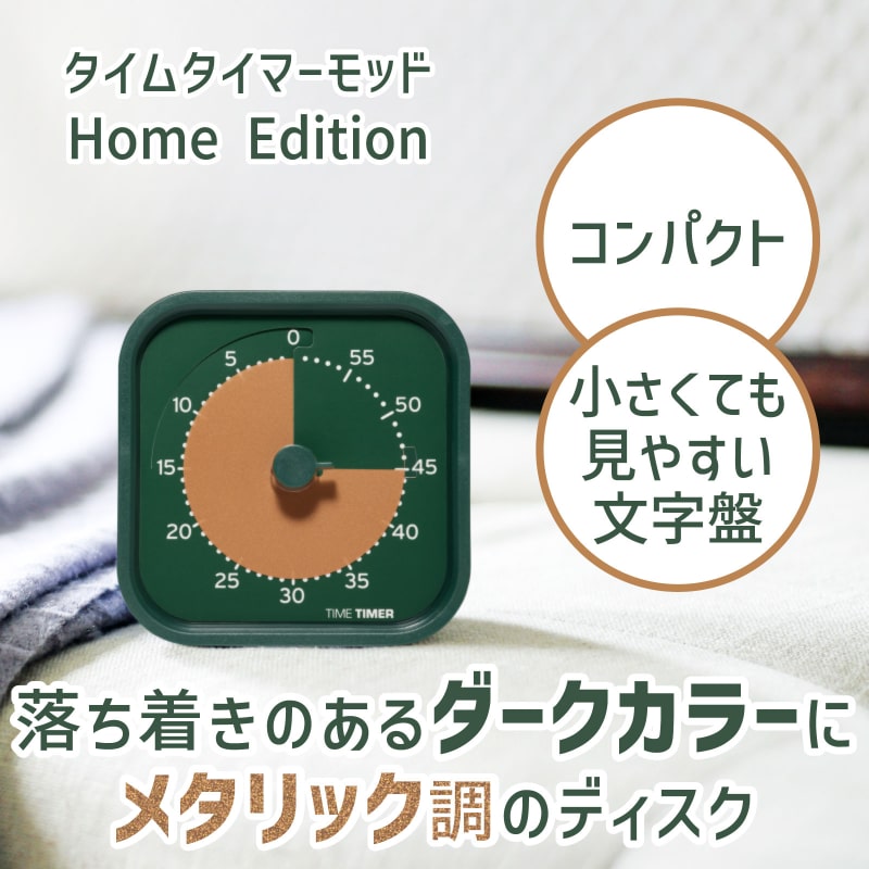 Time Timer MOD Home Editionに新色「メタリックフォレスト」が登場!落ち着いたツートンカラーとメタリック調ディスクが特徴のおしゃれな60分タイマーです。視覚的に時間の経過がわかるため、時計が読めない子どもや時間管理が苦手な方にも最適。静音設計・アラームON/OFF機能付きで使いやすく、自宅・学校・オフィスなどさまざまなシーンで活躍します。売上の1%はインクルーシブ教育支援に活用されます。