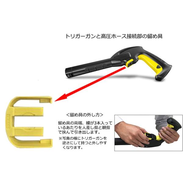 トリガーガンと高圧ホース接続部の留め具 工具を使わずに着脱