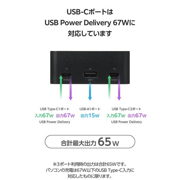 複数機器の充電もこれ1台で安心!67W出力のUSB Power Delivery規格に準拠する20400mAhモバイルバッテリーです。複数ポートでパソコンやスマートフォンなどの高速充電が同時にできます。LEDパネルでバッテリー残量を1%単位で確認しながら使えます。コンパクトサイズで持ち運びにも便利です。