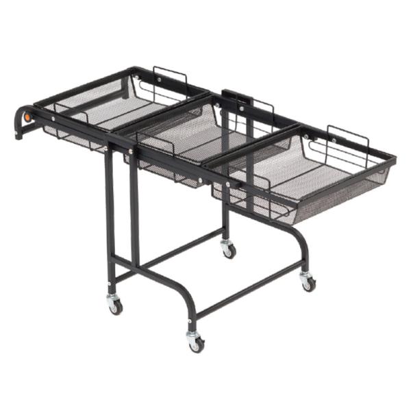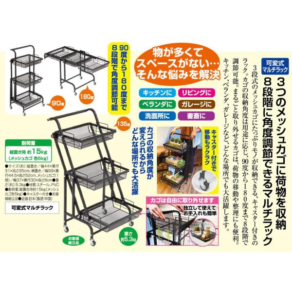 3つのメッシュカゴに荷物を収納 8段階に角度調節できるマルチラック