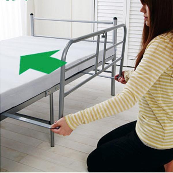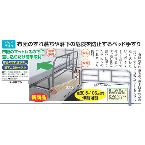 布団のずれ落ちや、落下防止のためのベット手すり。市販のマットレスの下に差し込むだけ。80.5〜106cmまで伸縮可能です。差し込み部分は折りたためるので収納にも便利。