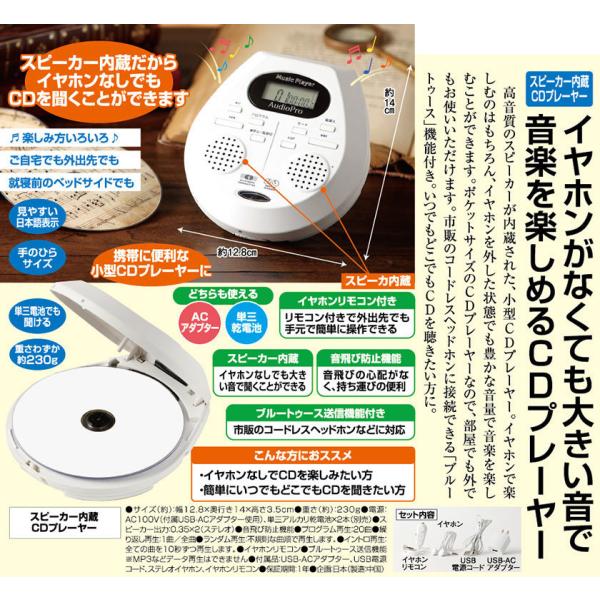 ●サイズ(約):幅12.8×奥行き14×高さ3.5cm●重さ(約):230g●電源:AC100V(付属USB-ACアダプター使用)、単三アルカリ乾電池×2本(別売)●スピーカー出力:0.35×2(ステレオ)●音飛び防止機能●プログラム再生:20曲●繰り返し再生:1曲/全曲●ランダム再生:不規則な曲順で再生します。●イントロ再生:全ての曲を10秒ずつ再生します。●イヤホンリモコン●ブルートゥース送信機能※MP3などデータ再生はできません●付属品:USB-ACアダプター、USB電源コード、ステレオイ