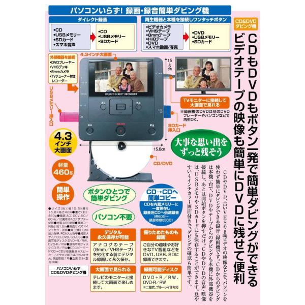 CDやDVD、古いVHSや8mmビデオの映像などを、パソコンを使わず簡単にダビングできる録音・録画機です。CDからのダビングは本機一台で、DVDやテープからのダビングも本機に外部機器を接続し、あとは開始ボタンを押すだけ。CDやDVDの音声・映像は、USBメモリやSDカードにも保存することができます。見やすい4インチカラー画面付きで、ダビングの確認も簡単です。
