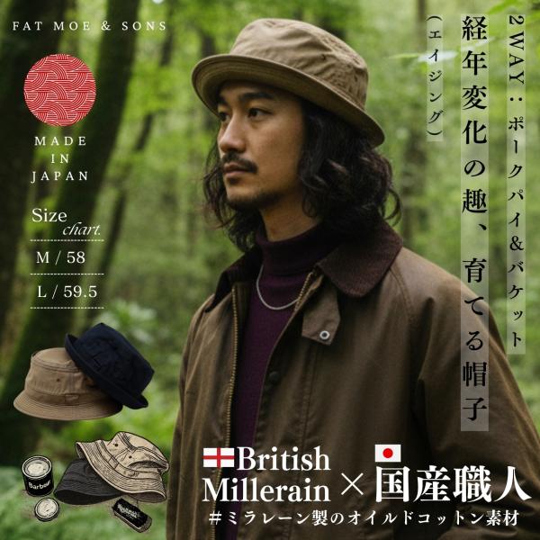 ポークパイハット メンズ British Millerain製 オイルドコットン 2WAY 帽子 カメラマンハット バケットハット ワックスドコットン 綿 育てる帽子 春夏 秋冬