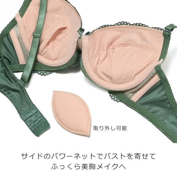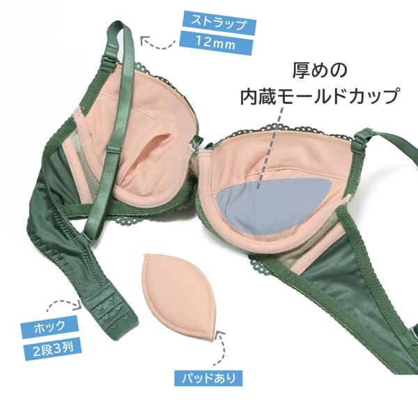 ブラカップは下厚のモールドカップと取り外し可能なパッドでバストを寄せ上げて、自然でふっくらしたバストに整えます。脇のボーンがしっかりアンダーのズレを抑えます。