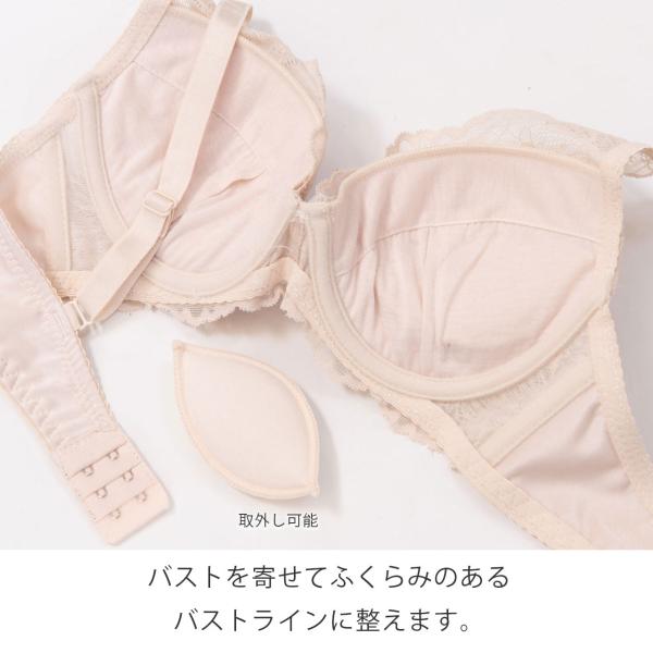ブラカップは下厚のモールドカップと取り外し可能なパッドでバストを寄せ上げて、自然でふっくらしたバストに整えます。脇のボーンがしっかりアンダーのズレを抑えます。