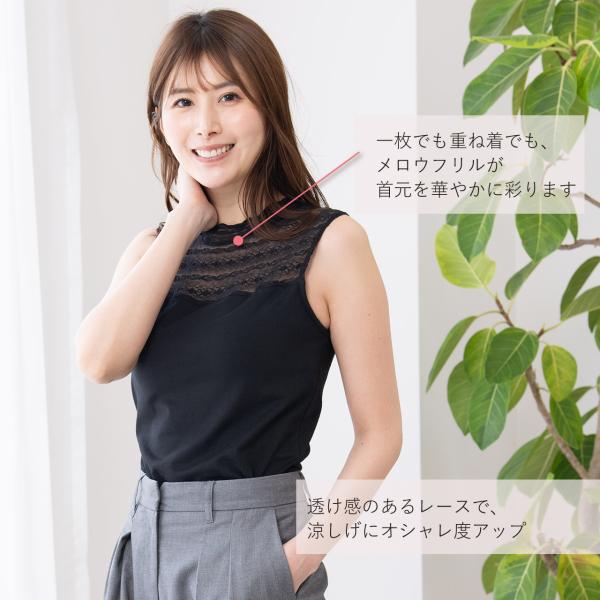 肌ざわりサラッとした生地と、首回りの透け感のあるレースで涼しげにオシャレ度アップ。