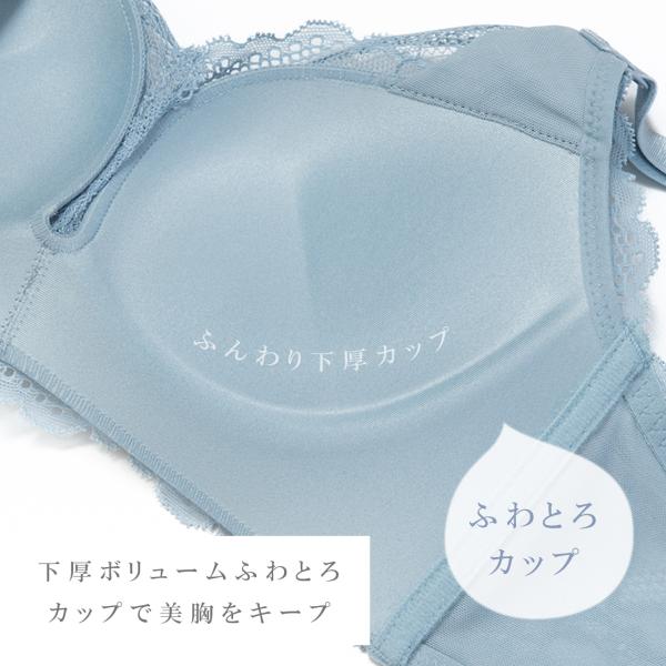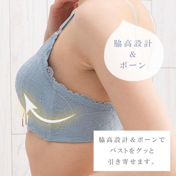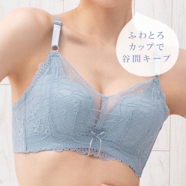 ふわふわのアンダーとカップが一体になっていてズレにくくバストをきれいにホールドしてくれます。下厚カップでボリュームアップ。サイドボーンが脇肉を押さえてくれます。上から着るタイプのフックなしです。贅沢な総レースで後ろ姿もとってもかわいい。肩ストラップ位置が外側に付いていて背中が空いている服でもおしゃれに着用できます。