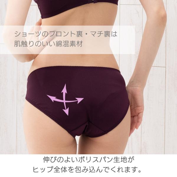 ショーツはスタンダードショーツで縦横伸びの良いストレッチ素材で、ヒップにフィット。日常使いにぴったりです。
