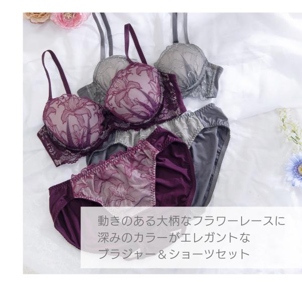 動きのある大柄なフラワーレースに深みのカラーがエレガントなブラジャー&ショーツセットです。
