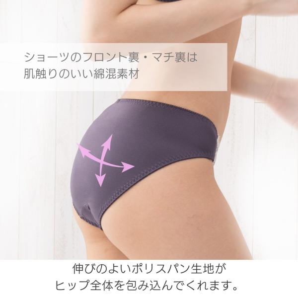 ショーツはスタンダードショーツで縦横伸びの良いストレッチ素材で、ヒップにフィット。日常使いにぴったりです。