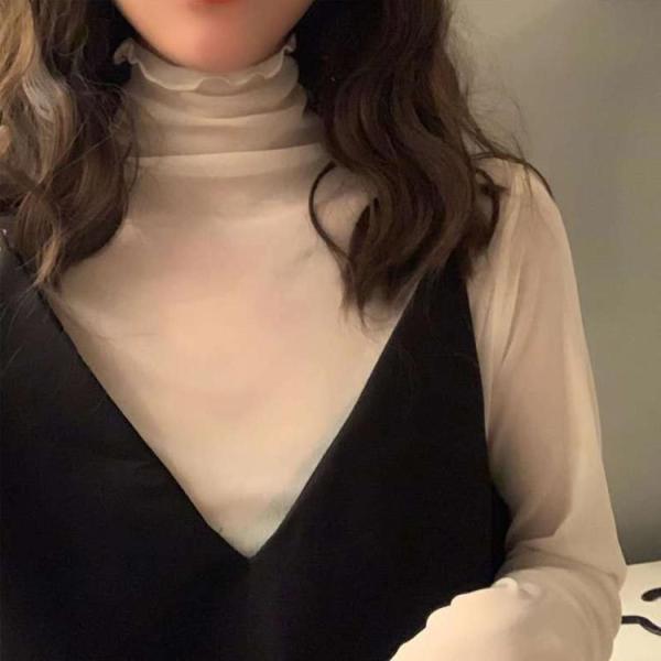 シアートップス チュールトップス レディース 長袖 tシャツ レース ハイネック 透け感 インナー トップス 送料無料 フリル袖 UV対策 紫外線対策