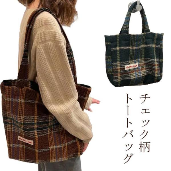 送料無料 トートバッグ 全2色 レディース 肩掛け 韓国ファッション バッグ かばん チェック柄 スクエア 大容量 配色 シンプル ファスナー 収納