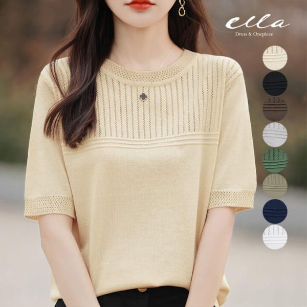 レディース 半袖 夏 春 トップス ニット 秋 Uネック 袖あり 上品 女性 大きめ ゆったり カジュアル サマーニット 無地 30代 40代 50代 yctops50