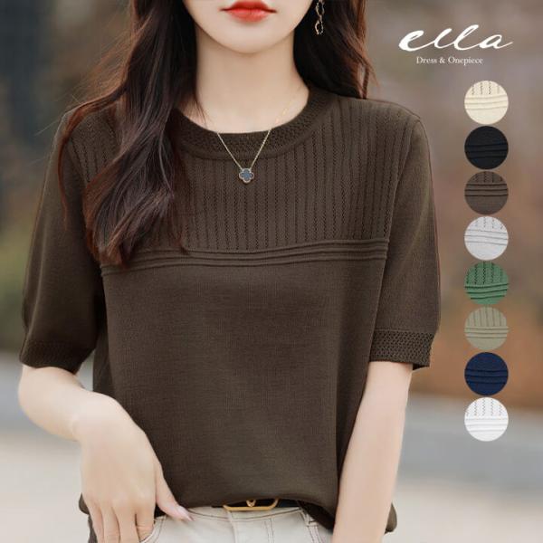 レディース 半袖 夏 春 トップス ニット 秋 Uネック 袖あり 上品 女性 大きめ ゆったり カジュアル サマーニット 無地 30代 40代 50代 yctops50
