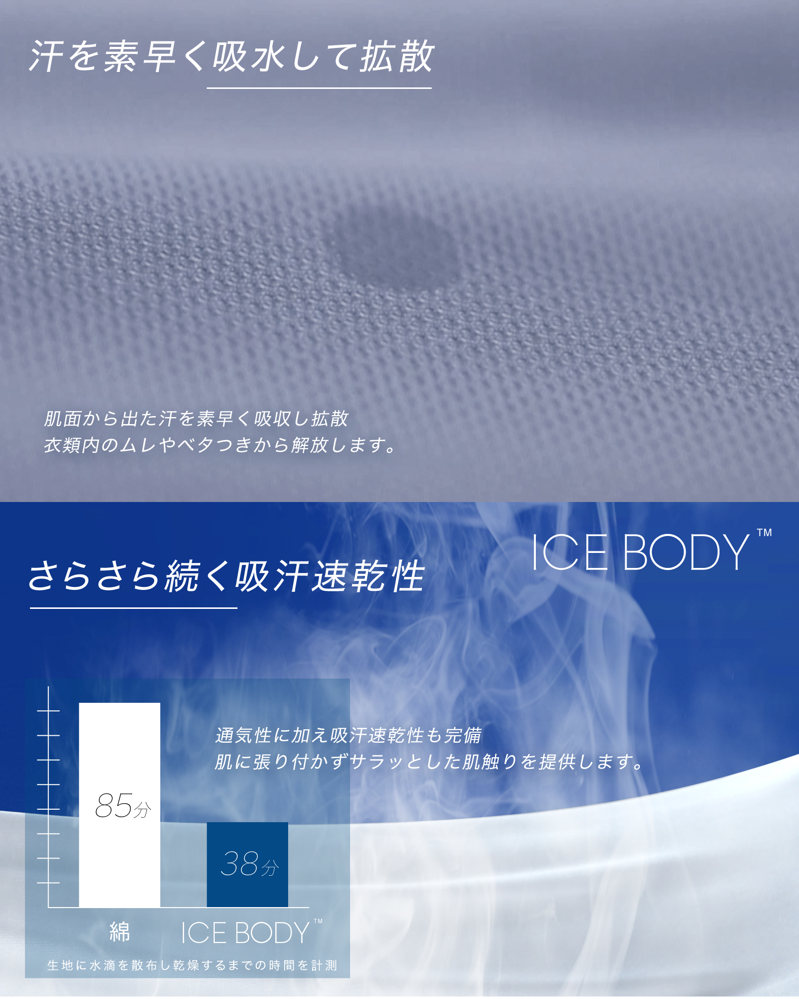 超強冷感インナーICEBODYは、汗をかいても速やかに水分を吸収し乾燥させる吸水速乾機能をも兼ね備えた男の味方。
