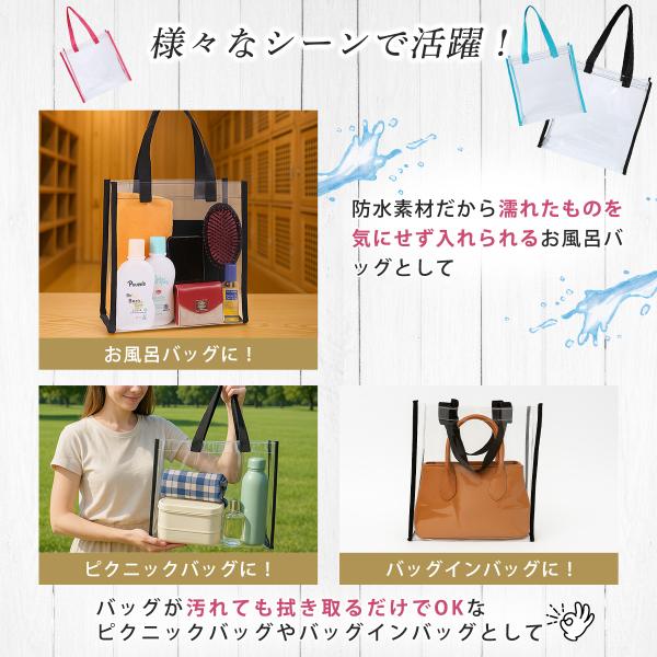 防水性のあるクリア素材だから、プール・海・温泉・スパバッグとしても便利です。