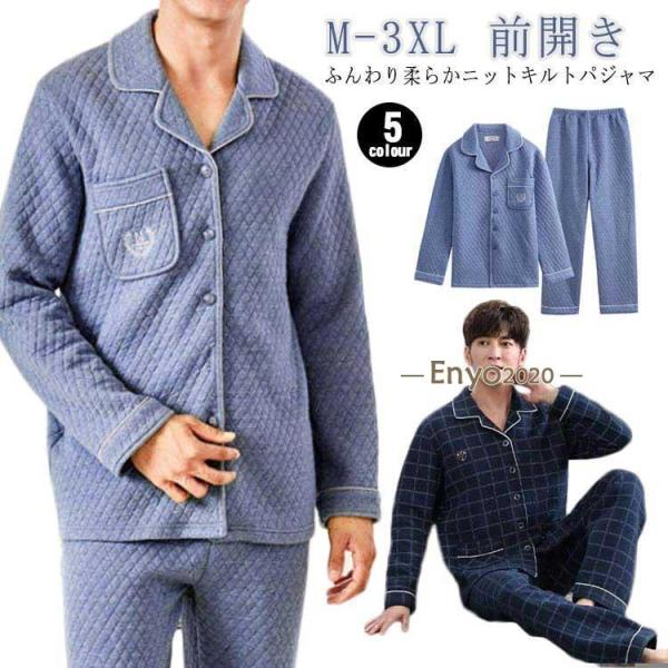 キルトニット 綿 セットアップ 厚手 ルームウェア パジャマ 前開き ニットキルト 上下セット 長袖 暖かい 入院 メンズ 男性 部屋着 大人 敬老の