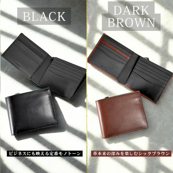 高級感溢れる レザー の風合いと、王道のクラシカルで シンプル なデザインが男らしくも おしゃれ な印象の 2つ折り財布