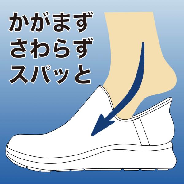 靴ベラがついたような踵の加工により、手を使わずに、屈まず触らずスパッと脱ぎ履きができ、型崩れしないので踏んでも折れません。