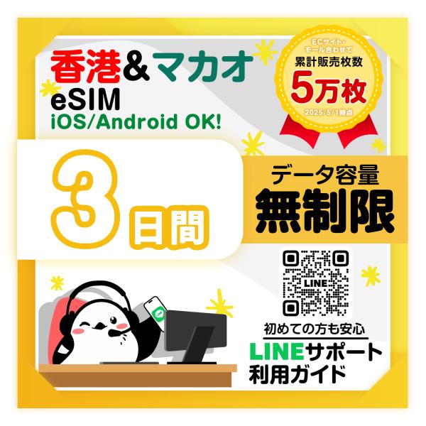 香港eSIM マカオeSIM:使用日数:3日間/データ容量:無制限/有効期限90日/最短即日発行/パスポート番号不要/データ通信専用/香港SIM