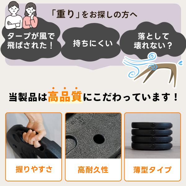 ペグダウンできない場所で活躍する5kg×4枚セットのマルチウエイト。持ち手付きで運びやすく、積み重ねて固定可能です。セメントタイプで水や砂の補充が不要。タープやテント、看板の固定などアウトドアからイベントまで幅広く重宝します。