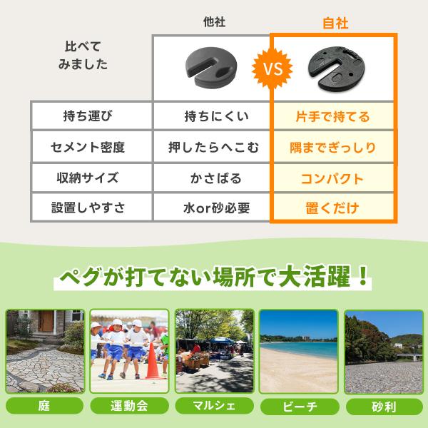 ・女性でも扱いやすい5kgタイプ。・片手で持ち運べる持ち手付き。・持ち手が地面に接していないので、運搬時に手を汚さない。・積み重ねて固定出来る。・セメントタイプで水や砂の重鎮不要。・外装をポリエチレンで加工しており、屋外の常設可能。・雨や汚れに強い。・1シーズン(180日)の製品保証付き。・意匠権申請中の独自構造商品。・台湾製の確かな技術と安心品質。