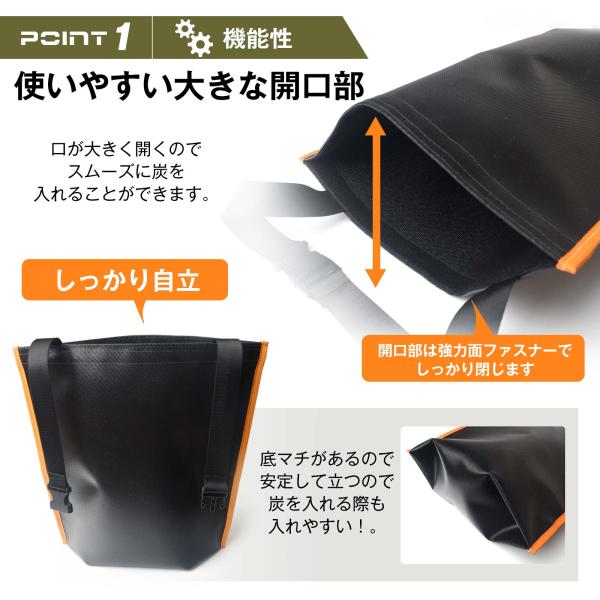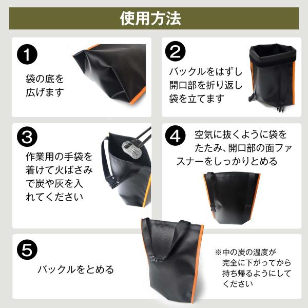 注意 ・袋の破損や運搬中の火災につながりますので、必ず消火後の炭を入れてご使用いただき、燃焼中の炭や高温の炭をそのまま入れないでください。